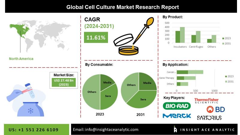 InsightAce Analytic Pvt. Ltd. announces the release of a market assessment report on the "Global Cell Culture Market Size, Share & Trends Analysis Report By Consumable (Media, Sera, Reagents), By Product (Culture Systems, Centrifuges, Incubators, Cryostorage Equipment, Biosafety Equipment, Instruments), By Application (Biopharmaceuticals, Tissue Culture & Engineering, Vaccine Production, Drug Development, Gene Therapy, Toxicity Testing, Cancer Research)- Market Outlook And Industry Analysis 2031"The global Cell Culture market is estimated to reach over USD 64.38 billion by 2031, exhibiting a CAGR of 11.23% during the forecast period.