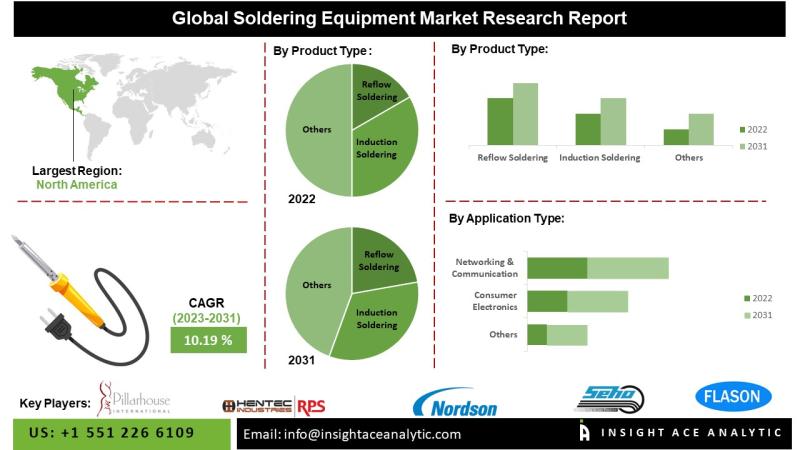 InsightAce Analytic Pvt. Ltd. announces the release of a market assessment report on the "Global Soldering Equipment Market Size, Share & Trends Analysis Report By Product Type (Reflow Soldering, Induction Soldering, Hot-Bar Reflow, Laser Soldering, Aluminium Soldering), Application Type (Consumer Electronics, Networking & Communication, Automotive, Aerospace & Defence, Others), Region, Market Outlook And Industry Analysis 2031"The Global Soldering Equipment Market is estimated to exhibit a CAGR of 10.19% during the forecast period.