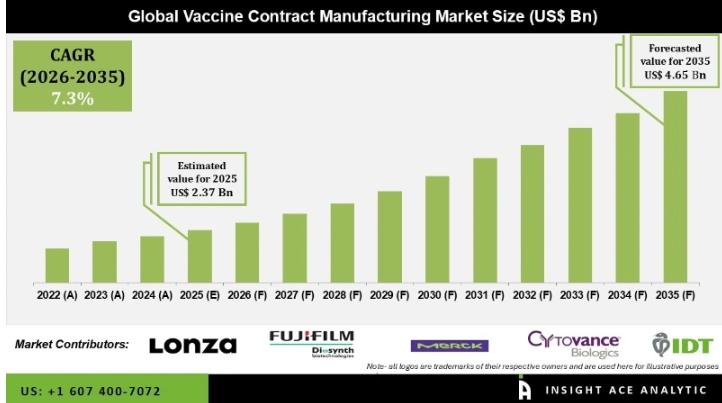 "Vaccine Contract Manufacturing Market Size is valued at USD 2.37 Bn in 2025 and is predicted to reach USD 4.65 Bn by the year 2035 at a 7.30% CAGR during the forecast period for 2026 to 2035.