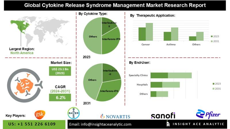 InsightAce Analytic Pvt. Ltd. announces the release of a market assessment report on the " Cytokine Release Syndrome Management Market - (By Cytokine Type (Tumor Necrosis Factor-TNF, Interleukins-II, Interferons-IFN, Epidermal Growth Factor-EGF), By Therapeutic Application (Cancer, Asthma, Airway Inflammation, Arthritis, Others), By Biomarker Type (Interleukin-10, Interleukin-6, Ferritin, Cluster of Differentiation-163), By Route of Administration (Oral, Intravenous), By End User (Hospitals, Specialty Clinics, Others)), Trends, Industry Competition Analysis, Revenue and Forecast…