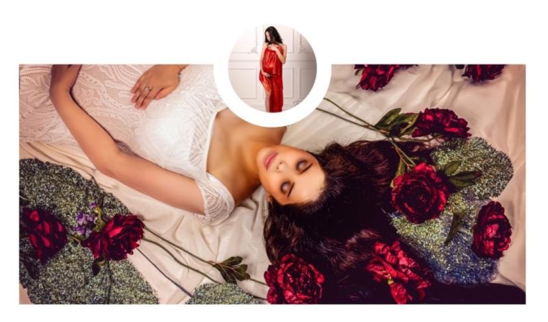 The studio has a large selection of maternity gowns available for photo shoots. After booking an appointment, clients receive a PDF with the available options to help coordinate with their husbands and children. The studio urges expectant mothers to capture the beauty of their baby bumps in clothes that make them feel confident and comfortable. Clients can also wear their own clothes for maternity photoshoots in Dubai. Meaningful props like sonogram images, baby shoes, and nursery decor are also encouraged.