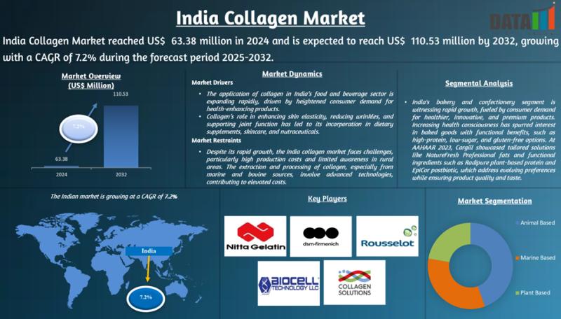 As per DataM intelligence research report "India Collagen Market reached US$ 63.38 million in 2024 and is expected to reach US$ 110.53 million by 2032, growing with a CAGR of 7.2% during the forecast period 2025-2032"