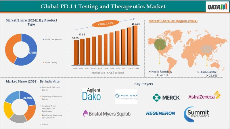 PD-L1 Testing and Therapeutics Market reached US$ 52.05 billion in 2023, increased to US$ 57.82 billion in 2024, and is expected to reach US$ 159.84 billion by 2033, growing at a CAGR of 11.6% during the forecast period 2025 to 2033.