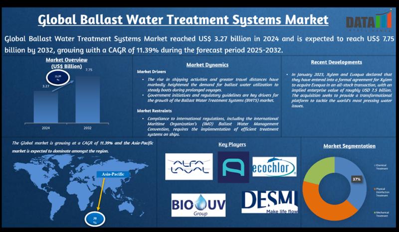 Global Ballast Water Treatment Systems Market reached US$ 3.27 billion in 2024 and is expected to reach US$ 7.75 billion by 2032, growing with a CAGR of 11.39% during the forecast period 2025-2032.