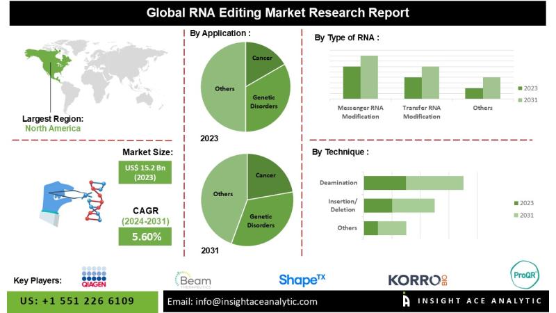 InsightAce Analytic Pvt. Ltd. announces the release of a market assessment report on the " RNA Editing Market - (By Type of RNA (Messenger RNA Modifications, Transfer RNA Modification, Ribosomal RNA Modification), By Application (Cancer, Genetic Disorders, Temporary Maladies), By Technique (Insertion/Deletion, Deamination), Trends, Industry Competition Analysis, Revenue and Forecast To 2031."
