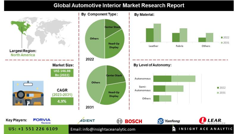 InsightAce Analytic Pvt. Ltd. announces the release of a market assessment report on the "Global Automotive Interior Market- (By Component Type (Center Stack, Head-up Display, Instrument Cluster, Rear Sear Entertainment, Dome Module, Headliner, Seat, Interior Lighting Door Panel, Center Console, Adhesives & Tapes, Upholstery, Others), By Material (Leather, Fabric, Vinyl, Wood, Glass Fiber Composite, Carbon Fiber Composite, Metal), By Level of Autonomy (Semi-Autonomous, Autonomous, Non-Autonomous),By Electric Vehicle (Battery Electric Vehicle…