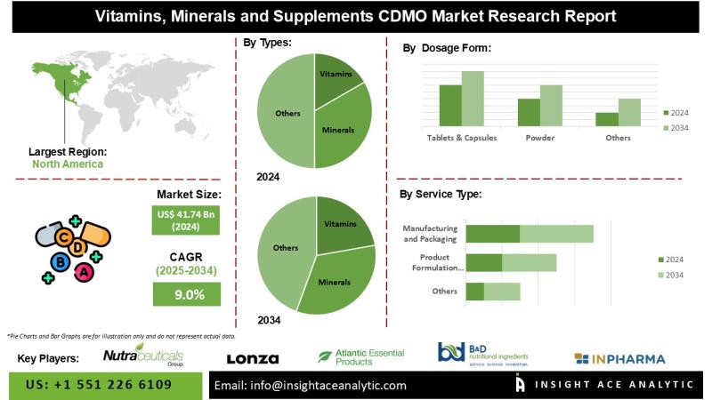 InsightAce Analytic Pvt. Ltd. announces the release of a market assessment report on the "Global Vitamins, Minerals and Supplements CDMO Market Size, Share & Trends Analysis Report By Types (Vitamins, Minerals,, Others), By Dosage Form (Tablets & Capsules, Powder, Softgel, Others), By Service Type (Product Formulation and Development, Manufacturing and Packaging, Research & Development (R&D), Regulatory Compliance, Others), By Company Size (Small Companies, Mid-Sized Companies, Large Companies)- Market Outlook…