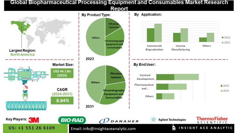 InsightAce Analytic Pvt. Ltd. announces the release of a market assessment report on the "Global Biopharmaceutical Processing Equipment and Consumables Market- (By Product Type (Filtration, Chromatography, Bioreactors, Cell Culture Media, Shakers, Services), Application (Vaccine Manufacturing, mAb Production, Cell and Gene Therapy Production and Others)), By End-user, By Region, Trends, Industry Competition Analysis, Revenue and Forecast To 2031."