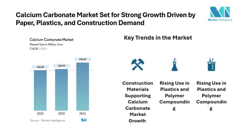 The Calcium Carbonate Market Size is estimated at 169.49 million tons in 2026, rising to 195.69 million tons by 2031, reflecting consistent usage across industrial and consumer applications. The material remains a widely used mineral because it performs two roles at once: it reduces production cost and improves product performance in many manufacturing processes. For more insights on Calcium Carbonate Market, please visit the Mordor Intelligence Page: https://www.mordorintelligence.com/industry-reports/calcium-carbonate-market?utm_source=openpr Calcium