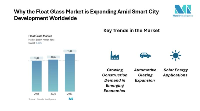 The Float Glass Market Size is estimated at 76.86 million tons in 2026, rising from 74.27 million tons in 2025 and projected to reach 91.18 million tons by 2031, expanding at a CAGR of 3.48% during the forecast period. The industry continues to benefit from stable demand across construction, automotive glazing, and solar energy applications. Float glass is a flat, distortion-free sheet essential for laminated and tempered glass products, offering