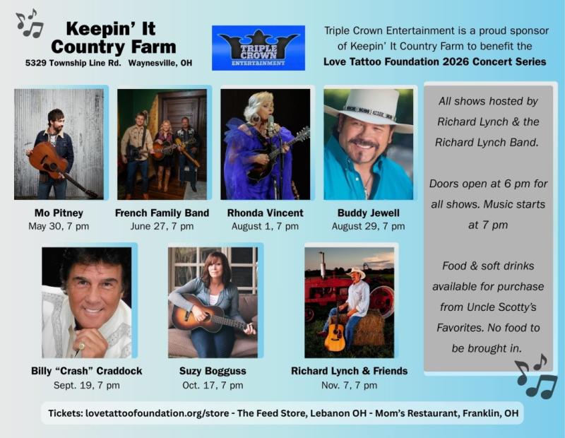 WAYNESVILLE, OH - March 2, 2026 - Keepin' It Country Farm, home of traditional country artist Richard Lynch, has unveiled the highly anticipated lineup for its 2026 Love Tattoo Foundation Benefit Concert Series . Set against the backdrop of the farm's stunning barn-style venue in historic Waynesville, Ohio, the concert series brings together some of country music's most beloved voices - all to…