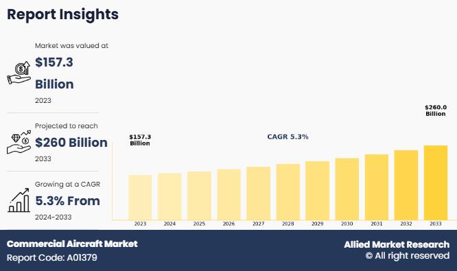 Allied Market Research published a report, titled, "Commercial Aircraft Market size by Aircraft Type (Narrow Body, Wide Body, Regional and Business Jet, and Freighter), Size (Small Aircraft, Medium Aircraft, and Large Aircraft), and Application (Passenger and Cargo): Global Opportunity Analysis and Industry Forecast, 2024-2033". According to the report, the global commercial aircraft market size was valued at $157.3 billion in 2023, and is projected to reach $260 billion by 2033,…