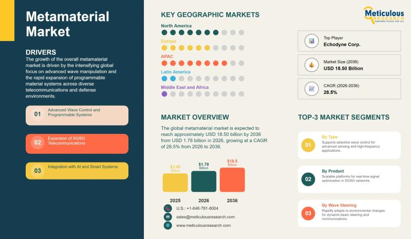 The global metamaterial market was valued at USD 1.45 billion in 2025 and is projected to grow from USD 1.78 billion in 2026 to approximately USD 18.50 billion by 2036, at a compound annual growth rate of 28.5%. That trajectory - more than a tenfold increase over a decade - reflects a technology that is crossing a critical threshold from scientific novelty to industrial necessity, finding applications across telecommunications, aerospace,…