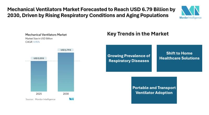 The mechanical ventilator market is valued at USD 5.33 billion in 2025 and is forecast to reach USD 6.79 billion by 2030, advancing at a 4.95% CAGR, according to research from Mordor Intelligence. The expansion in the mechanical ventilators market size is being supported by…