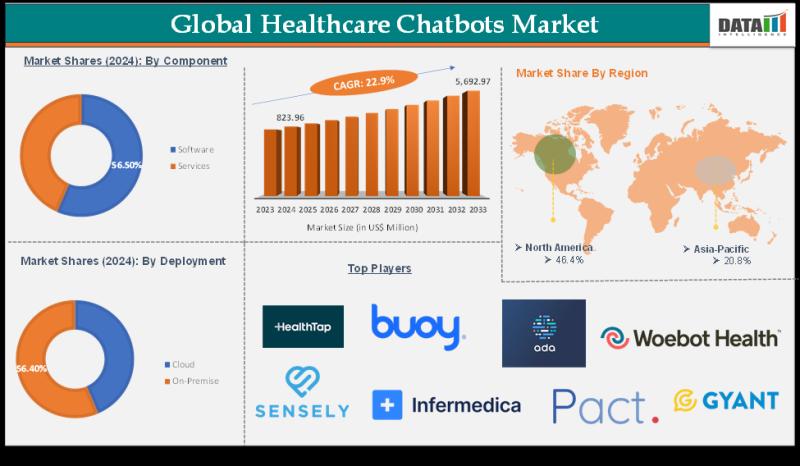 Market Size and Growth: The Healthcare Chatbots Market size reached US$ 823.96 Million in 2024 and is expected to reach US$ 5,692.97 Million by 2033, growing at a CAGR of 22.9% during the forecast period 2025-2033. DataM Intelligence has published a new research report on "Healthcare Chatbots Market Size 2026". The report explores comprehensive and insightful Information about various key factors like Regional Growth, Segmentation, CAGR, Business Revenue Status of Top Key