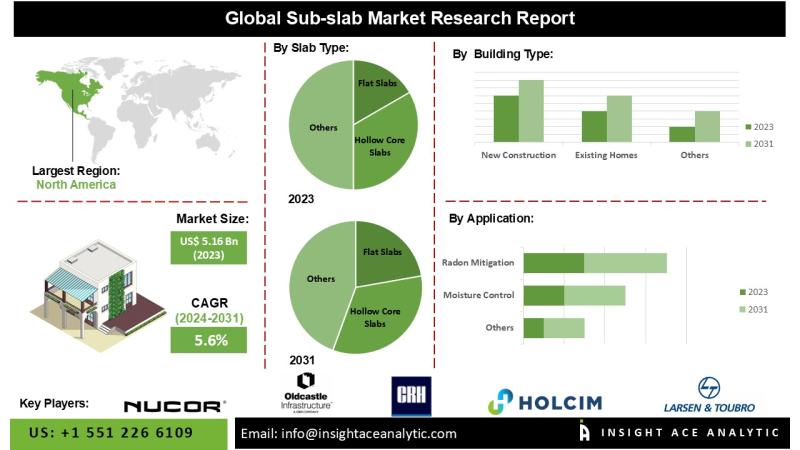 InsightAce Analytic Pvt. Ltd. announces the release of a market assessment report on the "Global Sub-slab Market - (By Slab Type (Flat Slabs, Hollow Core Slabs, Pre-tensioned Slabs, Pre-stressed Slabs, Post-tension Slabs, Composite Slabs, Others), By Building Type (New Construction, Existing Homes), By Application (Moisture Control, Radon Mitigation, Insulation, Storage and Access, Others)), Trends, Industry Competition Analysis, Revenue and Forecast To 2031."