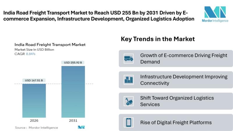 According to Mordor Intelligence, the India road freight transport market size [https://www.mordorintelligence.com/industry-reports/india-road-freight-transport-market?utm_source=abnewswire] is estimated at USD 167.51 billion in 2026, increasing from USD 153.9 billion in 2025, and is projected to reach USD 255.92 billion by 2031, registering a CAGR of…
