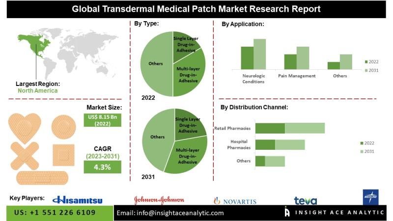 InsightAce Analytic Pvt. Ltd. announces the release of a market assessment report on the "Global Transdermal Medical Patch Market- (By Type (Single Drug-in-Adhesive, Multi-layer Drug-in Adhesive, Reservoir, Vapor Patch, Matrix), By Application (Neurologic conditions, Pain Management, Nicotine Cessation, Cardiovascular Disorders, Hormonal Therapy, others), By Distribution Channel (Hospital Pharmacies, Retail Pharmacies, Online Pharmacies)), Trends, Industry Competition Analysis, Revenue and Forecast To 2034."
