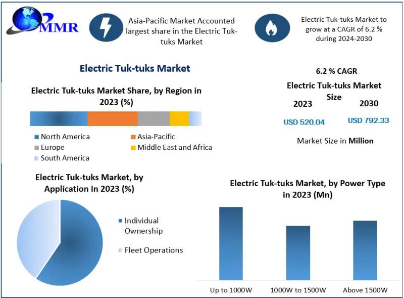 The Electric Tuk-tuks Market is valued at USD 520.04 million in 2023 and is projected to reach a value of USD 792.33 million by 2030 at a CAGR of 6.2% during the forecast period from 2024 to 2030. The market is expected to grow considerably due to the growing need for sustainable transport solutions and government actions that seek to support sustainable mobility.Get a Free Sample PDF of this Research Report for more insights:https://www.maximizemarketresearch.com/request-sample/171589/