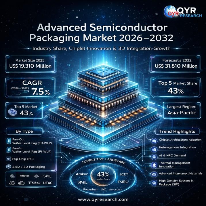 The global Advanced Semiconductor Packaging Market is entering a new growth phase as next-generation semiconductor applications require higher performance, improved power efficiency, and smaller form factors. According to the latest industry analysis, the market is expected to expand from US$ 19.31 billion in 2025 to US$ 31.81 billion by 2032, registering a CAGR of 7.5% during the forecast period.