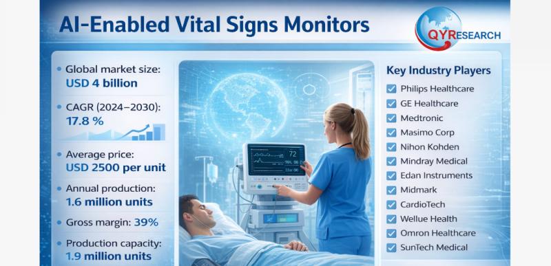 QY Research has released a comprehensive new market report on AI-Enabled Vital Signs Monitors, are medical devices that use artificial intelligence algorithms to continuously measure, analyze, and interpret physiological parameters such as heart rate, blood pressure, respiratory rate, oxygen saturation (SpO2), temperature, and ECG, enabling early detection of abnormalities and predictive clinical insights.