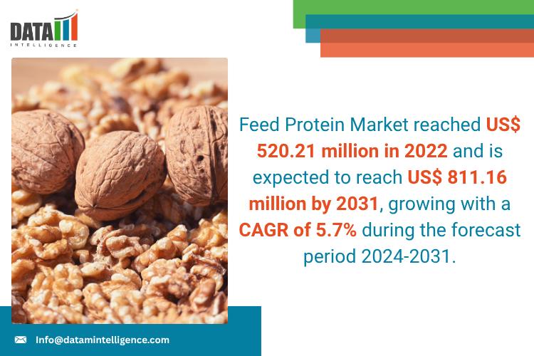 Global Feed Protein Market reached US$ 520.21 million in 2022 and is expected to reach US$ 811.16 million by 2031, growing with a CAGR of 5.7% during the forecast period 2024-2031.