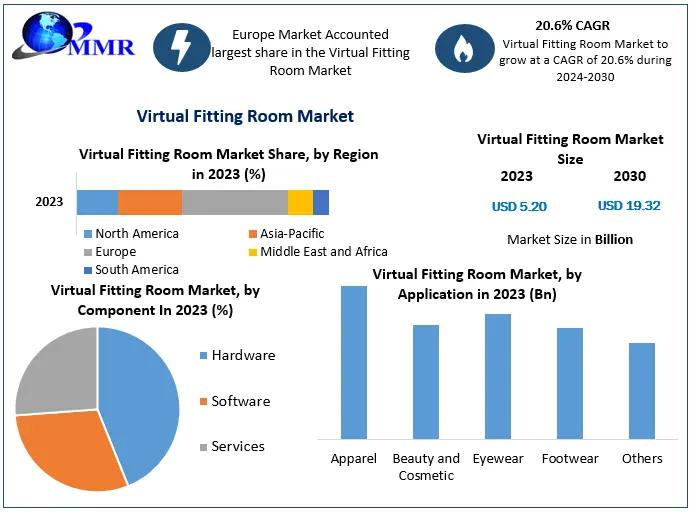 The Virtual Fitting Room Market valued at USD 5.20 billion in 2023, is projected to grow at a CAGR of 20.6% from 2024 to 2030 reaching USD 19.32 Bn. in 2030.