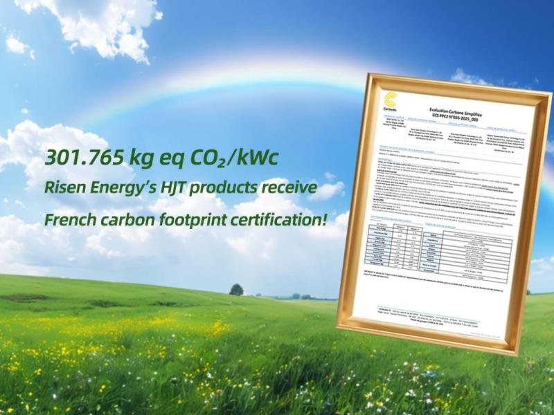 Risen Energy's Hyper-ion series HJT modules have achieved a new breakthrough in France's carbon footprint certification, with a certified value of 301.765 kg eq CO/kWc - nearly 19% lower than conventional modules-setting a new benchmark for low-carbon manufacturing in the PV industry.