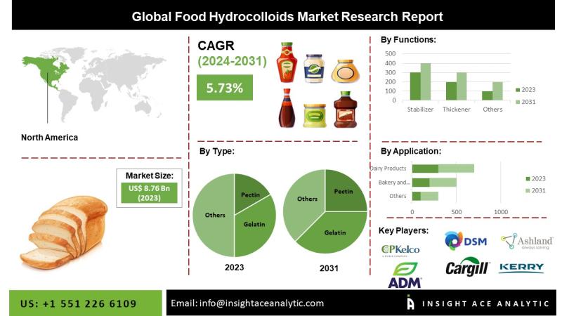 InsightAce Analytic Pvt. Ltd. announces the release of a market assessment report on the "Global Food hydrocolloids Market Size, Share & Trends Analysis Report by Type (Gelatin, Carrageenan, Xanthan Gum, Alginates, Agar, Pectin, Gum Arabic, Locust Bean Gum), Application (Bakery And Confectionery, Meat And Poultry Products, Beverages, Dairy Products, Sauces And Dressing), Source (Plant, Animal, Microbial, Seaweed, And Synthetic) And Function (Thickener, Stabilizer, Coating Material, Fat Replacer, And Gelling Agent)- Market Outlook And Industry Analysis 2031"The global food hydrocolloids market is estimated to reach over USD 13.39 billion by 2031, exhibiting a CAGR of 5.47% during the forecast period.