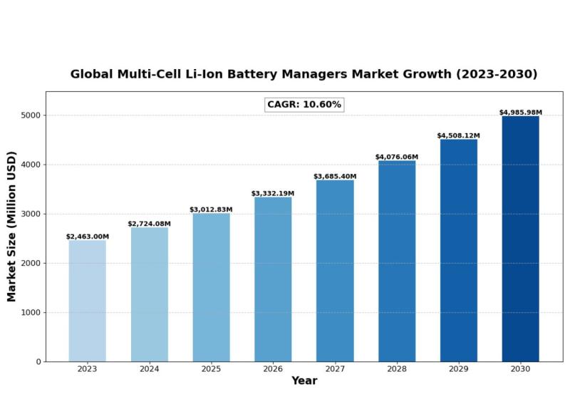 The global Multi-Cell Li-Ion Battery Managers Market size was estimated at USD 2463 million in 2023 and is projected to reach USD 4985.98 million by 2030, exhibiting a CAGR of 10.60% during the forecast period.