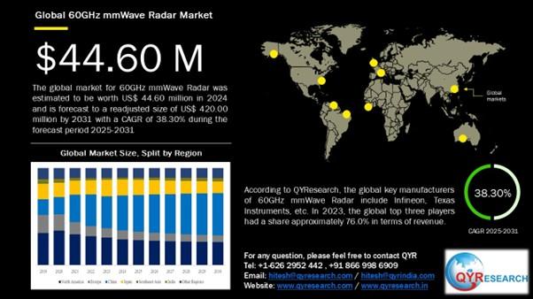 The 60GHz millimeter-wave (mmWave) radar market is witnessing a remarkable surge, driven by its diverse applications across industries such as automotive, industrial automation, security, healthcare, and smart home systems. With its high-resolution imaging and sensing capabilities, 60GHz mmWave radar technology is setting new benchmarks in precision and efficiency. According to QYResearch, the global market for 60GHz mmWave Radar was valued at US$ 44.6 million in 2024 and is projected to reach US$ 420 million by 2031, growing at a robust CAGR of 38.3%.To get a sample or know more, please do click on the below link: https://www.qyresearch.in/request-sample/electronics-semiconductor-global-60ghz-mmwave-radar-market-research-report-2025