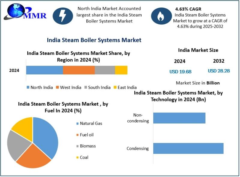 India Steam Boiler Systems Market Poised for Significant Growth Amidst Technological Advancements and Strategic CollaborationsThe India steam boiler systems market is experiencing robust growth, driven by rapid industrialization and increasing demand across sectors such as chemicals, refineries, and power generation. According to recent analyses, the market size was valued at USD 19.68 billion in 2024 and is projected to reach USD 28.28 billion by 2032, exhibiting a Compound Annual Growth Rate (CAGR) of 4.63% during the forecast period.