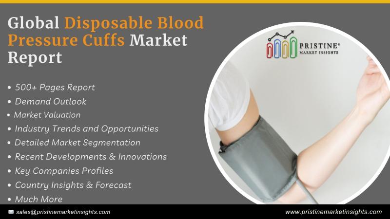 2025 - Pristine Market Insights, a leading market research firm, announced the release of its latest and comprehensive market research report on Disposable Blood Pressure Cuffs market. The report spans over 500 pages and delivers 10-year market forecast in US dollars (or custom currencies upon request). It provides in-depth analysis of market dynamics (drivers, opportunities, restraints), PESTLE insights, latest industry trends, and demand factors. The report includes segmented market value, share (%), compound annual growth rate (CAGR), and year-on-year growth projections, along with regional forecasts for the next decade. Key market insights for leading countries are covered & detailed profiles of the top 20+ companies are included, with additional profiles available upon request.The disposable blood pressure cuffs market is witnessing significant growth due to the increasing demand for hygiene and infection control in medical settings. These cuffs are designed for single-use, ensuring that patients are not exposed to cross-contamination between different users. With rising healthcare awareness, particularly in hospitals, clinics, and home healthcare, disposable blood pressure cuffs offer convenience and safety. The growing adoption of these cuffs in diagnostics and preventive healthcare, along with advancements in cuff materials and designs, is contributing to the expansion of the market globally, catering to a diverse patient population.