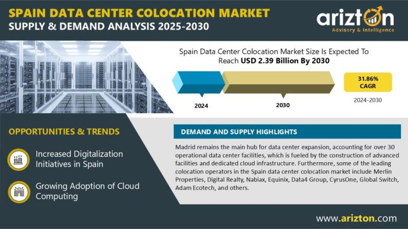 According to Arizton research, the Spain data center colocation market [https://www.arizton.com/market-reports/spain-data-center-colocation-market] size was valued at USD 455 million in 2024 and is expected to reach USD 2.39 billion by 2030, growing at a CAGR of 31.86% during the forecast period.