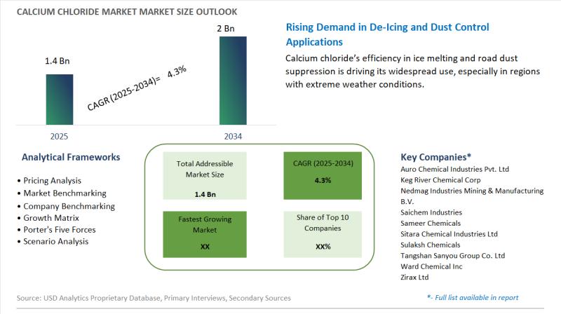 The Global Calcium Chloride Market Size is estimated at $1.4 Billion in 2025 and is forecast to register an annual growth rate (CAGR) of 4.3% to reach $2 Billion by 2034.The latest study released on the Global Calcium Chloride Market by USD Analytics Market evaluates market size, trend, and forecast to 2034. The Calcium Chloride market study covers significant research data and proofs to be a handy resource document for managers, analysts, industry experts and other key people to have ready-to-access and self-analyzed study to help understand market trends, growth drivers, opportunities and upcoming challenges and about the competitors.