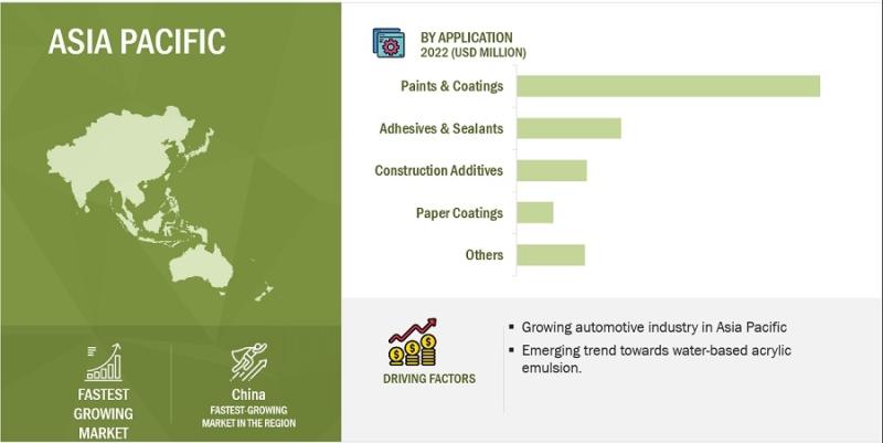 The markets of Asia Pacific are registering high growth, and the trend is projected to continue during the forecast period. Emerging economies such as India, and China are investing in various industrial developments that are driving the acrylic emulsion market..The Asia Pacific region has a large population and a growing middle class, leading to increased consumer purchasing power and demand for automobiles. As the demand for vehicles rises, so does the need for acrylic emulsion in various applications. This strong consumer base and growing vehicle ownership contribute to the robust market potential for acrylic emulsion in the region.