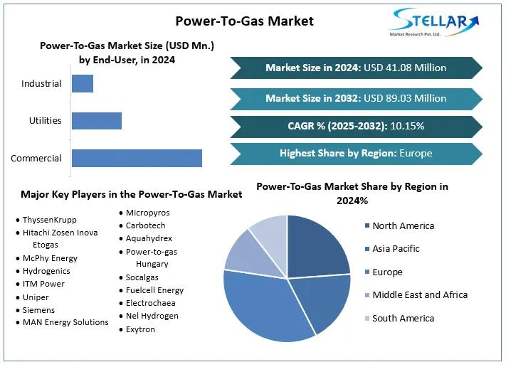 Power-To-Gas Market was valued at USD 41.08 Mn. in 2024, and it is expected to reach USD 89.03 Mn. by 2032 with a CAGR of 10.15% during the forecast period (2025-2032)