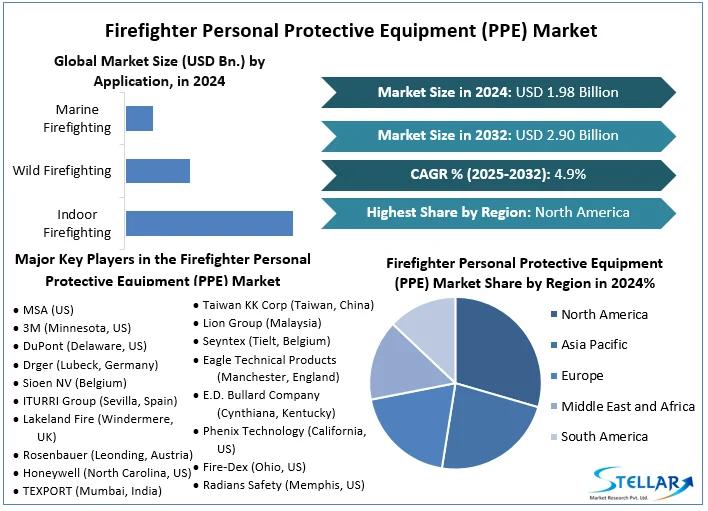 Firefighter Personal Protective Equipment (PPE) Market size was valued at USD 1.98 Bn. in 2024 and the total revenue is expected to grow at 4.9% through 2025 to 2032, reaching nearly USD 2.90 Bn. by 2032.