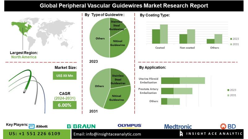InsightAce Analytic Pvt. Ltd. announces the release of a market assessment report on the "Global Peripheral Vascular Guidewires Market- (By Type Of Guidewires (Nitinol Guidewires, Stainless Steel Guidewires, Composite guidewires), By Coated Type (Coated (Hydrophobic coating, Hydrophilic coating), Non-coated), By Application (Chemoembolization, Prostate Artery Embolization, Uterine Fibroid Embolization, Gastrointestinal (GI) bleeding Embolizations, Bronchial Artery Embolizations, Trauma Related Embolizations, Others), By End-Users (Hospitals, Ambulatory Surgical Centers, Specialty Clinics, Others)), Trends, Industry…