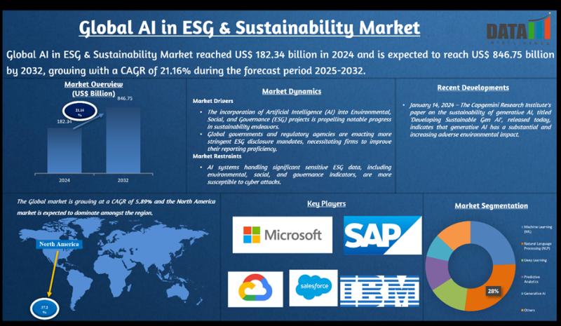 AI in ESG & Sustainability market was valued US$ 8,033.19 Million in 2025 and is expected to reach US$ 846.75 billion by 2032, growing with a CAGR of 21.16% during the forecast period 2026-2033, according to DataM Intelligence report.