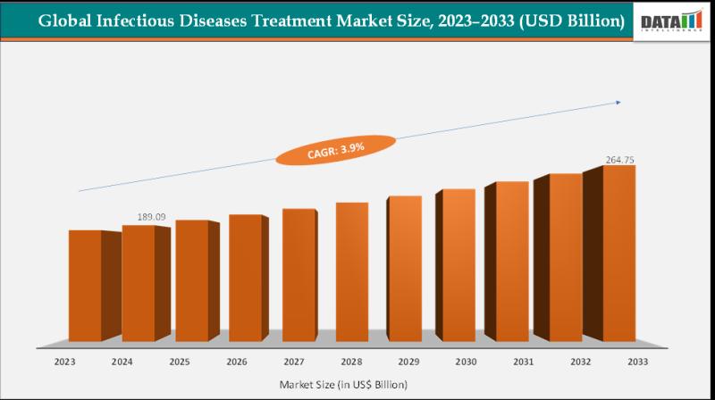The Global Infectious Diseases Treatment Market size reached US$ 189.09 Billion in 2024 from US$ 182.65 Billion in 2023 and is expected to reach US$ 264.75 Billion by 2033, growing at a CAGR of 3.9% during the forecast period 2025-2033.
