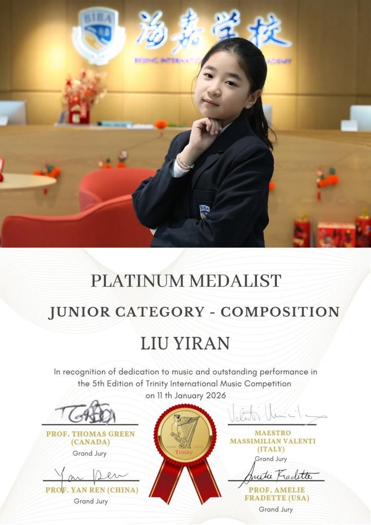 A 10-year-old student from China, Liu Yiran, has won the Platinum Award at the 2025 Trinity International Music Competition, an international event that attracts young musicians from around the world.