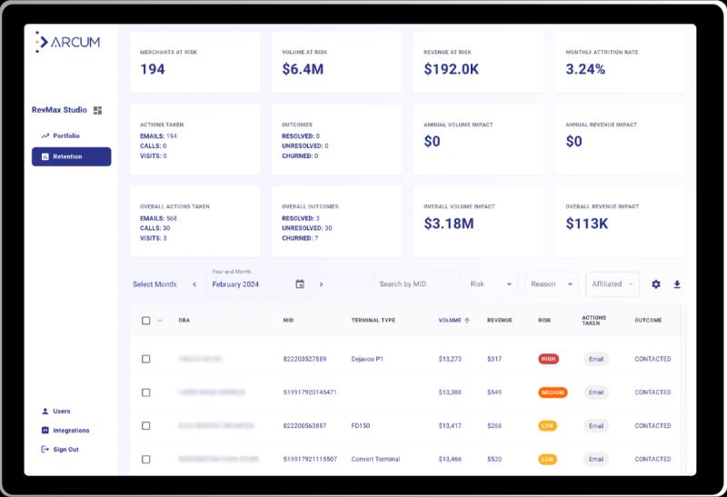 Arcum is the pioneering payment technology company and developer of RevMax Studio. RevMax Studio is an innovative AI-driven platform designed to reduce client turnover and improve revenue results in the payments industry, serving acquirers, ISOs, payment facilitators, and other merchant service providers. By leveraging machine learning, Arcum analyzes vast amounts of transactional and macroeconomic data to detect patterns, predicting merchant attrition and suggesting preemptive actions for retention and revenue opportunities. Its real-time tracking feature allows users to monitor and adjust retention strategies based on feedback, ensuring continuous improvement. With Arcum, customers enhance merchant relationships, foster long-term business growth, and increase revenue by effectively managing their merchant portfolio through data-informed decisions. For more, please visit www.arcum.ai