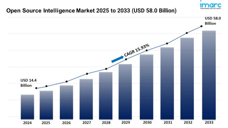 Market Overview:The open source intelligence market is experiencing rapid growth, driven by data abundance & analysis tools, cybersecurity & threat detection and regulatory compliance & investigative support. According to IMARC Group's latest research publication, "Open Source Intelligence Market Size, Share, Trends and Forecast by Source Type, Technique, End User, and Region, 2025-2033 ", The global open source intelligence market size was valued at USD 14.4 Billion in 2024. Looking forward, IMARC Group estimates the market to reach USD 58.0 Billion by 2033, exhibiting a CAGR of 15.93% from 2025-2033.