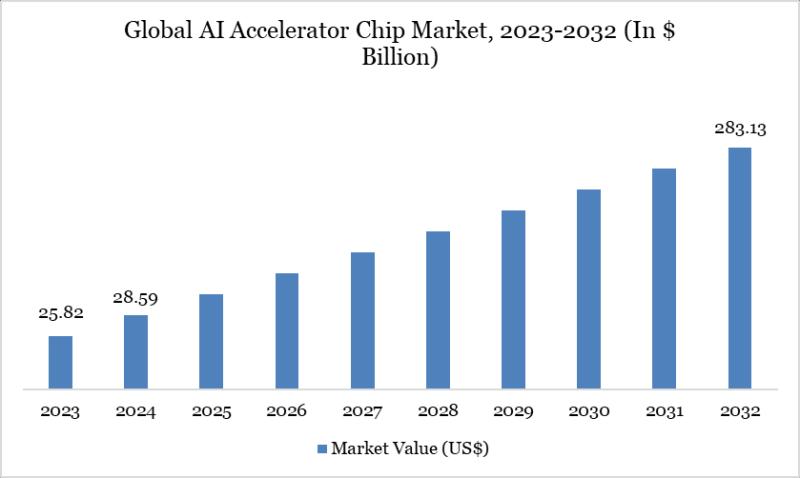 As per DataM intelligence research report "Global AI Accelerator Chip Market reached US$ 28.59 billion in 2024 and is expected to reach US$ 283.13 billion by 2032, growing with a CAGR of 33.19% during the forecast period 2025-2032."