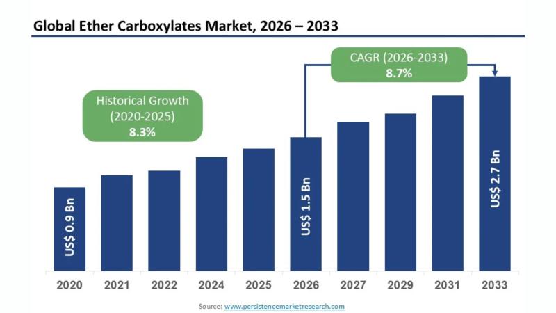 The ether carboxylates market is witnessing robust expansion as industries increasingly adopt high-performance, environmentally compatible surfactants. According to the latest study by Persistence Market Research, the global ether carboxylates market size is likely to be valued at US$1.5 billion in 2026 and is expected to reach US$2.7 billion by 2033, growing at a strong CAGR of 8.7% during the forecast period from 2026 to…