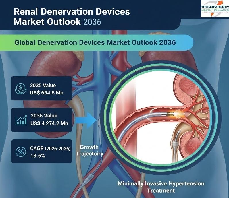 The global renal denervation devices market is entering a high-growth phase, driven by the rising prevalence of uncontrolled and resistant hypertension worldwide. Valued at US$ 654.5 million in 2025, the market is projected to reach a substantial US$ 4,274.2 million by 2036, expanding at a strong compound annual growth rate (CAGR) of 18.6% from 2026 to 2036.
