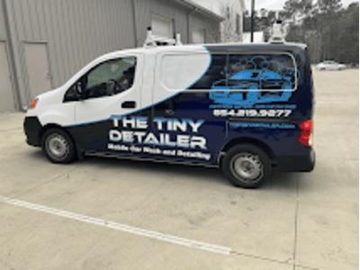 A branded service van from The Tiny Detailer is parked outside a facility, displaying the company’s contact number and mobile detailing services. The design emphasizes convenience and professionalism in car wash and detailing solutions.