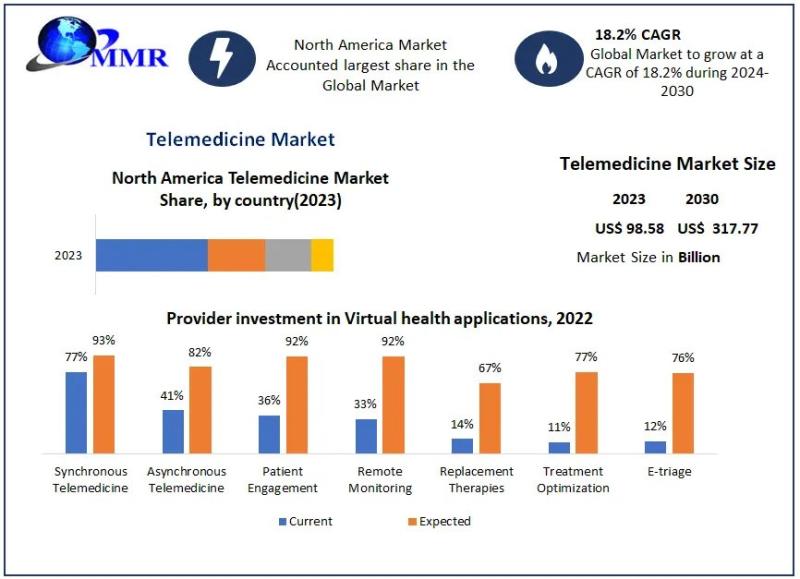 Telemedicine Market was valued at USD 98.58 Bn in 2023 and is expected to reach USD 317.77 Bn by 2030, at a CAGR of 18.2 percent during the forecast period.