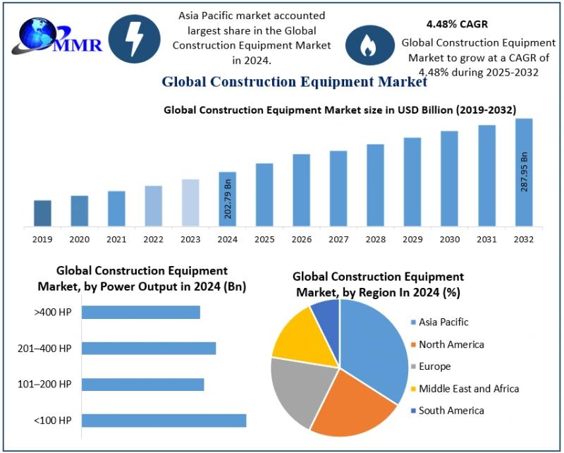 ► Construction Equipment Market Poised for Significant Growth Amidst Infrastructure DevelopmentsThe global construction equipment market is on a trajectory of substantial growth, driven by rapid urbanization, increased infrastructure investments, and technological advancements. Valued at USD 202.79 billion in 2024, the market is projected to reach approximately USD 287.95 billion by 2032, expanding at a compound annual growth rate (CAGR) of 4.48% from 2025 to 2032.